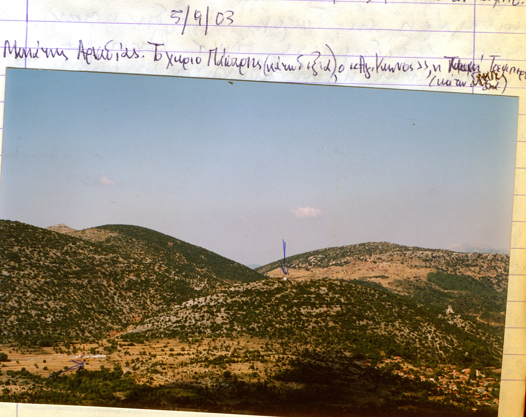 Στα νότια απλωνόταν ο απέραντος σιτοβολώνας του κάμπου της Μαντίνειας αλλά το λόφο Γκορτσούλι τον έκρυβε ένας άλλος λόφος πολύ κοντά στο Πικέρμι. Ο ουρανός είχε εντωμεταξύ σκοτεινιάσει και ο ήλιος έπαιζε κρυφτό μέσα από τα μετακινούμενα σύννεφα. Εκατό περίπου μέτρα, και λιγότερο, από το εικονοστάσι του «Αγιοκωσταντίνου» [και Ελένης] ο επίτροπος μου έδειξε ένα χορταριασμένο αλώνι, απαντώντας έτσι στην ερώτησή μου αν υπήρχαν αλώνια εκεί κοντά (όπως ήταν και αναμενόμενο για μένα) και το φωτογράφισα, ενώ ενισχυόταν η υποψία μου για την παρουσία της «Αγαλένης» εδώ.